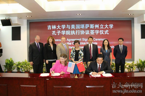 在随后举行的签字仪式上,许琳代表孔子学院总部与美国堪萨斯州立大学教务长兼常务副校长阿普里尔•梅森(April Mason) 签署《中国孔子学院总部与美国堪萨斯州立大学关于合作设立堪萨斯州立大学孔子学院的协议》,李元元代表吉林大学与阿普里尔•梅森签署《吉林大学与美国堪萨斯州立大学关于合作建设堪萨斯州立大学孔子学院的执行协议》。国家汉办副主任静炜、吉林大学副校长陈岗、堪萨斯州立大学文理学院院长皮特•多豪特(Peter Dorhout)、外事处副处长克里斯蒂•杨(Kristine Young)、技术和航空学院院长韦尔纳•菲茨西蒙斯(Verna Fitzsimmons)、教务长中国事务特别助理史记暑以及吉林大学国际合作与交流处、快猫短视频