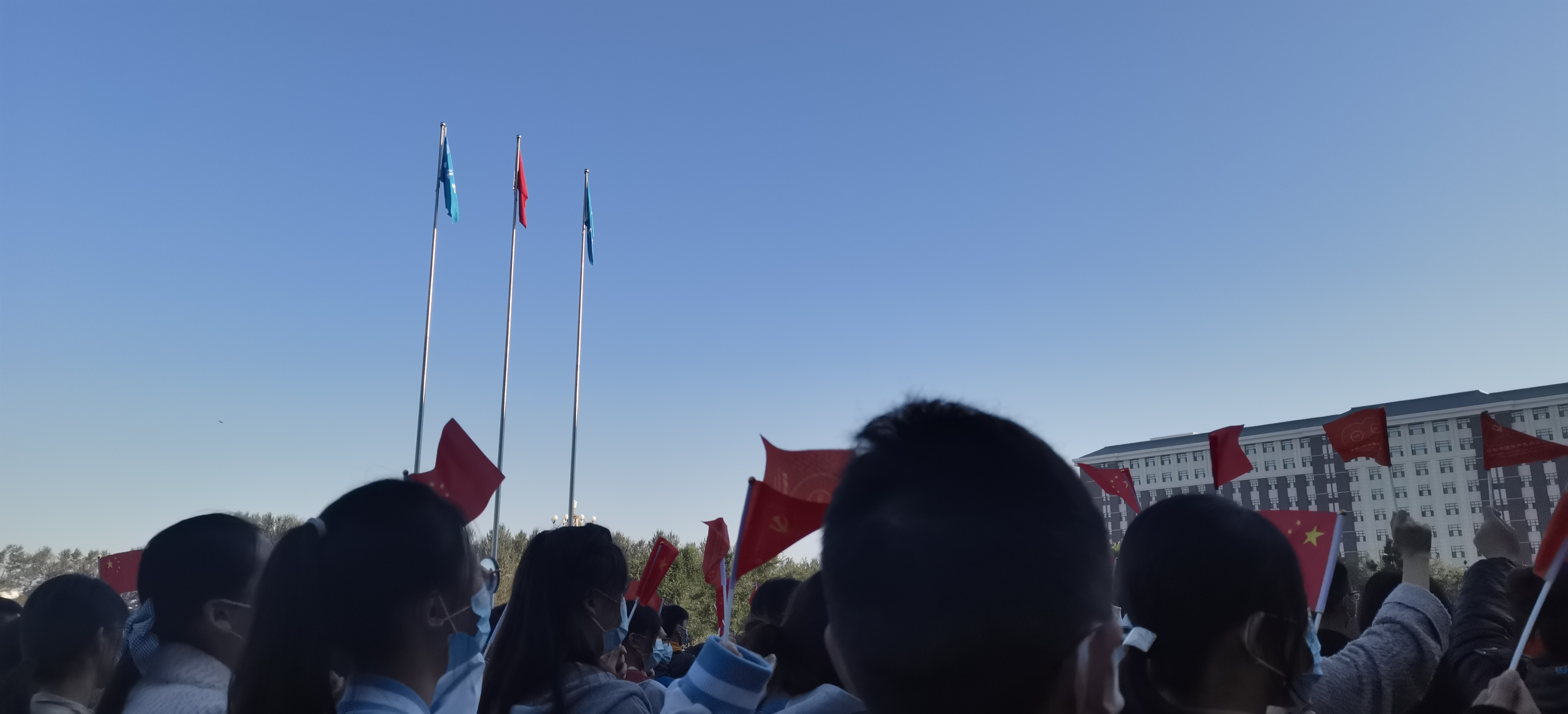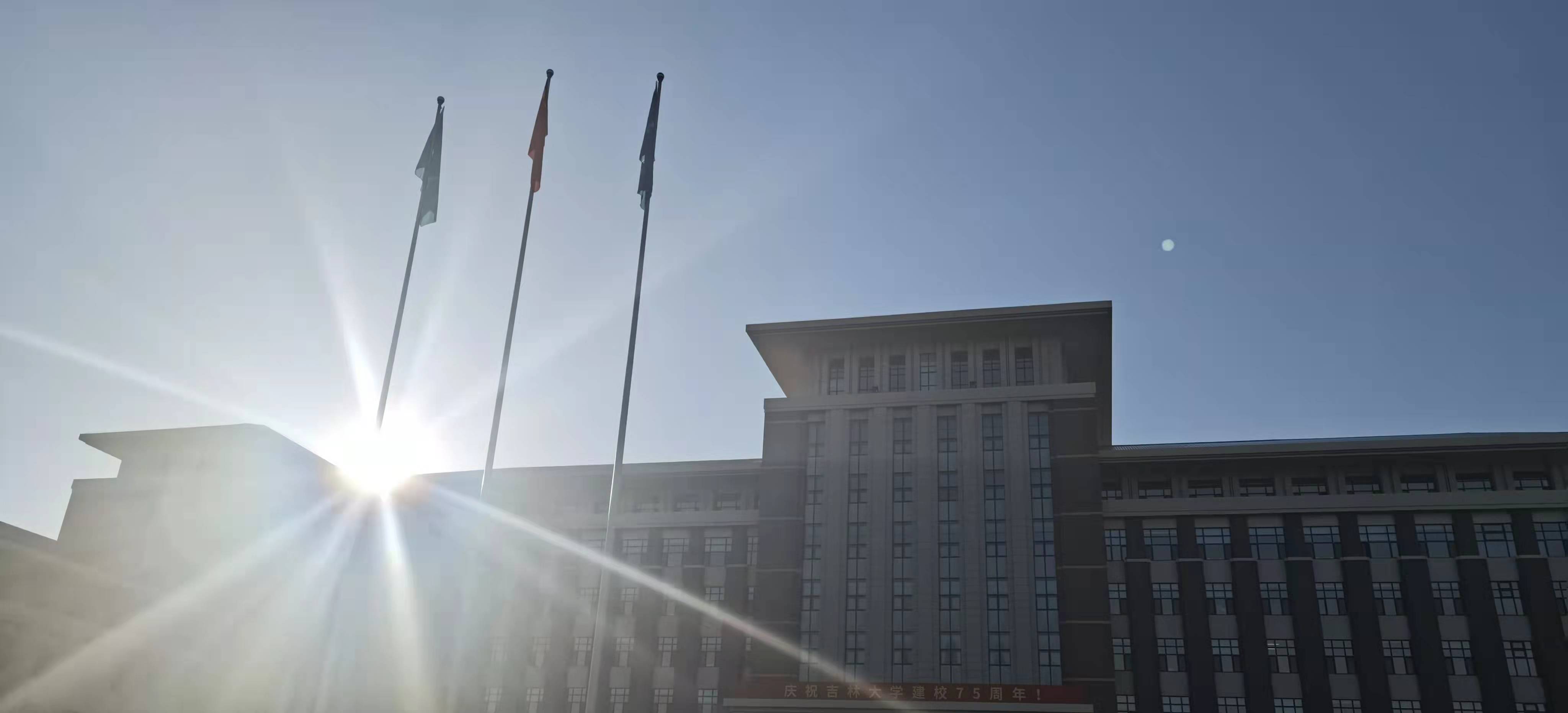 金秋十月,天高云淡,迎着和煦的朝阳,国旗护卫队的同学们踏着整齐的步伐来到了场地中央。嘹亮庄重的国歌响彻广场,鲜艳的五星红旗冉冉升起,在场师生爱国情怀油然而生。随后,吉林大学校旗在激昂的校歌声中缓缓上升,飘扬在蓝天之间。升旗礼毕,全体师生挥舞着手中的国旗并深情合唱《歌唱祖国》。