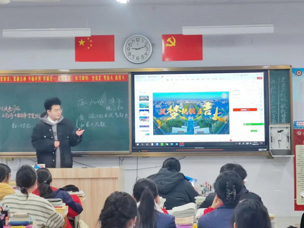 本科生张紫睿带领“相约百年三中,点燃青春梦想”母校行宣讲小队来到阜阳市第三中学高一(10)班开展宣讲活动。她向同学们介绍了吉林大学各大校区,其中的三化教室、图书馆、体育场馆以及美丽风景等深深地吸引了同学们。此外,她还着重宣传了我校特色“日新楼”、地质博物宫、历史名人纪念馆以及丰富多彩的社团活动,引来学弟学妹们的赞叹。最后,张紫睿同学介绍了吉林大学“返乡送站班车”、灾害补助以及考研贫困学子补助等温暖行为,向学弟学妹们展示吉大的人文关怀。