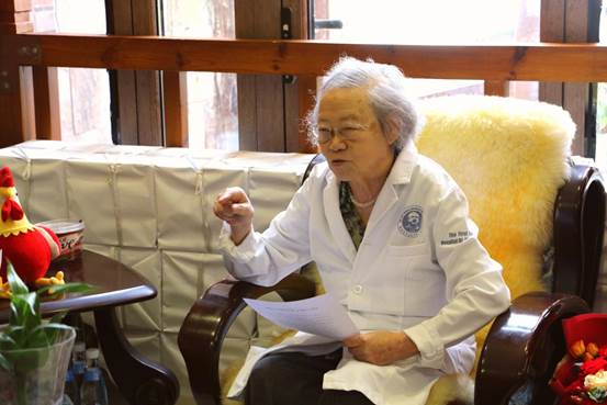 饶老师讲述了自己幼时在战争中求学,她见证了战争的残忍,经历了家人的离世。看到同胞在战场上负伤、看到亲人饱受疾病自己却无能为力,自此幼年的饶老师便将家国情怀内化于心、外化于行,立志成为一名救死扶伤的医生。求学数年,饶老师以优异成绩从北京大学医学院毕业,尽管当时有更好的工作选择,但饶老师最后仍然选择了自己坚持的医生职业,饶老师说:“我从小就想当大夫,给患者治病,一直到最后还是当了大夫,就这么当了一辈子大夫,到现在70年了,就这么一段简单的历史。”朴素的语言却难掩饶老师以坚定的理想信念坚守初心。从医70年,老师遇见许多棘手的病情,正是医务工作者救死扶伤、医者仁心的职业本能使老师细心分析每一位患者的病情,治愈患者的同时也挽救了无数个家庭,生动的故事感染着每一位在场师生。饶老师常说身为医者要“德才兼备”,“德”就是全心全意为人民服务,“才”就是打好专业知识基础,以身作则也勉励着更多的年轻力量。饶老师在和师生分享心中“德才兼备”医者故事时,向大家介绍了她求学时《神经解剖》课程的张教授,其教学上的严谨态度、对患者的仁爱之心深深地影响着饶老师。饶老师手中的书仍保存完好,书中密密麻麻且工整的批注更是体现了饶老师踏实谨学的态度。